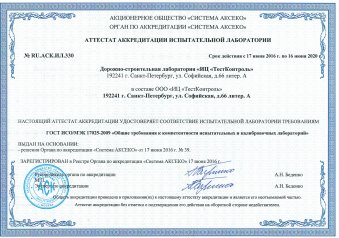 Строительная лаборатория ООО "ИЦ"ТестКонтроль" подтвердила свое соответствие требованиям ГОСТ ИСО/МЭК 17025-2009 "Общие требования к компетентности испытательных и калибровочных лабораторий". В июне 2016г. получен аттестат аккредитации №RU.АСК.ИЛ.330 сроком действия по 16 июня 2020 года.